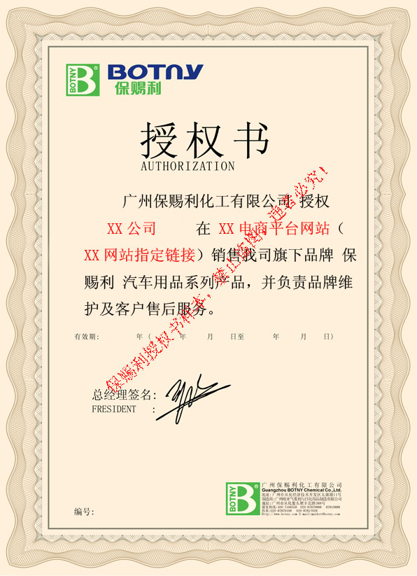 1、請各位網絡買家在購買廣州保賜利化工有限公司旗下系列品牌之系列產品時,選擇正規(guī)、正品網店進行購買,我司已對銷售我司產品網絡銷售商予以審查,并對合格網銷商簽發(fā)專屬網絡銷售運營授權書,為維護廣大網絡買家權益,我司在本平臺予以公布授權書標準版本,以供大家購買保賜利產品時鑒別正品賣家。(授權書標準版本請見本頁下示圖片)